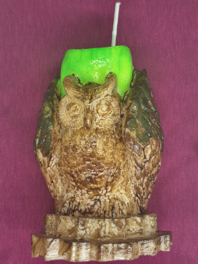Veladora de Buho Para Solicitar Consejo Guia Inspiracion y Tomar decisiones Recibir Sabiduria Pintado a mano tonos varios verdes cafe_B